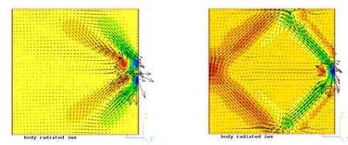 ωの値は、振動体のサイズに関連する波数 k を持つ、垂直に対して 45 度の方向を向いた内部波のビームを生成するために取られます。図からわかるように、内部波のエネルギーは垂直に対して45度のビーム状に伝わり、上面と下面の境界で反射し、後方に関しては下流の境界で反射して、発生源の位置に戻ります。