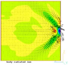 海洋の密度成層深部で振動または屈曲する物体 (魚、潜水艇など) は、物体から離れて伝播する内部波を生成し、いくつかの異常な特性を持ちます。特に、振動する物体からの内部波は、一定の波位相の線に垂直ではなく、それに沿ってエネルギーを伝播します。PHOENICS を使用してこれらの特性のいくつかを説明しますが、移動体に対する MOFOR 機能を使用して計算を拡張します