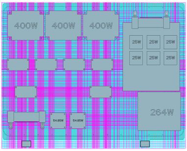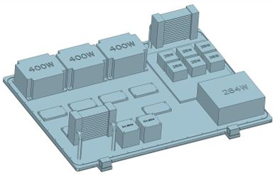 検討対象の車載用IGBTモジュールの動作周囲温度は50℃です。冷却媒体は、エチレングリコールと蒸留水を体積比50/50で混合したものです。冷却プレートにおける冷却液入口温度は60℃、流量は15L/分です。1つのIGBTの放熱電力は988Wです。その他のコンポーネントの放熱負荷は、図1のモデルに注釈として示されています。すべての電子部品の材料はシリコンで、冷却プレートの材料はAL6061です。このシミュレーションでは、液体冷却条件下におけるIGBTの温度分布のみをモデル化しています。