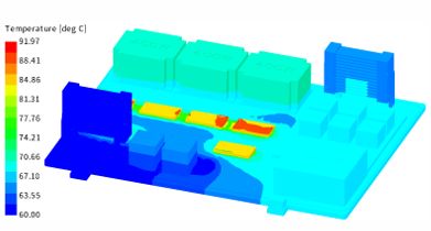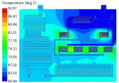 図4の表面温度コンタ図から、最高温度は91.97℃で、流路出口に最も近いIGBT部品で発生していることがわかります。このIGBTの温度が全体的に高いのは、冷却液が上流側のIGBTから順番に熱をうけとり、徐々に温度が上昇するためです。IGBTの最高温度は130℃未満であり、他の電子部品の温度もすべて80℃未満であることから、IGBTモジュールは熱設計要件を満たしていることがわかります。