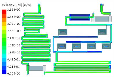 コールドプレート(液冷のヒートシンク)の冷却チャネルの中央を通る断面を作成しました。この断面の温度と速度の等高線図をそれぞれ図5と図6に示します。結果から、コールドプレート内の高温領域は主にIGBTの下に分布していることがわかります。IGBT直下の冷却液の最高温度は約83℃です。左側の流路の温度は比較的低くなっています。これは、この領域の部品からの放熱量が比較的少なく、コールドプレートとの接触面積が大きいためです。コールドプレートのほとんどの領域における流速は約2m/sで、最大流速は3.79m/sです。IGBT領域の狭い冷却チャネル内では、流速は約1.5m/sです。この流速は、IGBTモジュールから熱を迅速に除去するのに十分です。