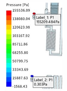 4. コールドプレートの入口側圧力は155,209 Pa、出口側圧力は0 Paで、チャネル全体の圧力降下は155.2 kPaです