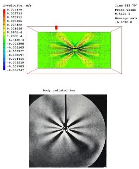 図 3. 上の図は、物体の短時間の変位に対する PHOENICS の初期結果を示しています (ケース 4)。下の図は、同様の設定での初期の実験結果を示しています (Ref 1 p315、図 77a より引用、T.N. Stevenson 撮影)