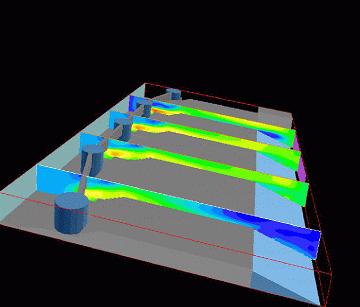 したがって、スキマーウォールのコストはまさに1999-2000年の節約分ということになり、さらに、その節約は50年以上続くと考えられます。400フィートに渡って水底を持ち上げるスキマーウォールを持つ取水路の数値モデリングでは、スキマーウォール下の最大速さは、現況の0.5fpsと比較して1.5fpsになります。計算された速度プロファイルは、316b問題(取水構造による魚の吸込み/衝突)の評価に用いられました。 |
